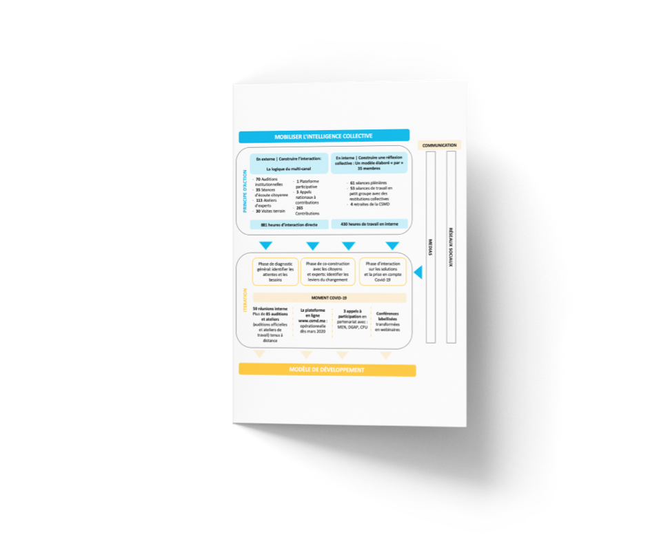 طبقا للتوجيهات الملكية السامية، اعتمدت اللجنة مقاربة تشاركية من أجل إعداد النموذج التنموي: اعتمدت هذه المقاربة على إشراك مختلف القوى الحية للأمة في مسلسل الإعداد وتمكين المواطن المغربي من الانخراط بشكل واسع في إطار هذا المسلسل